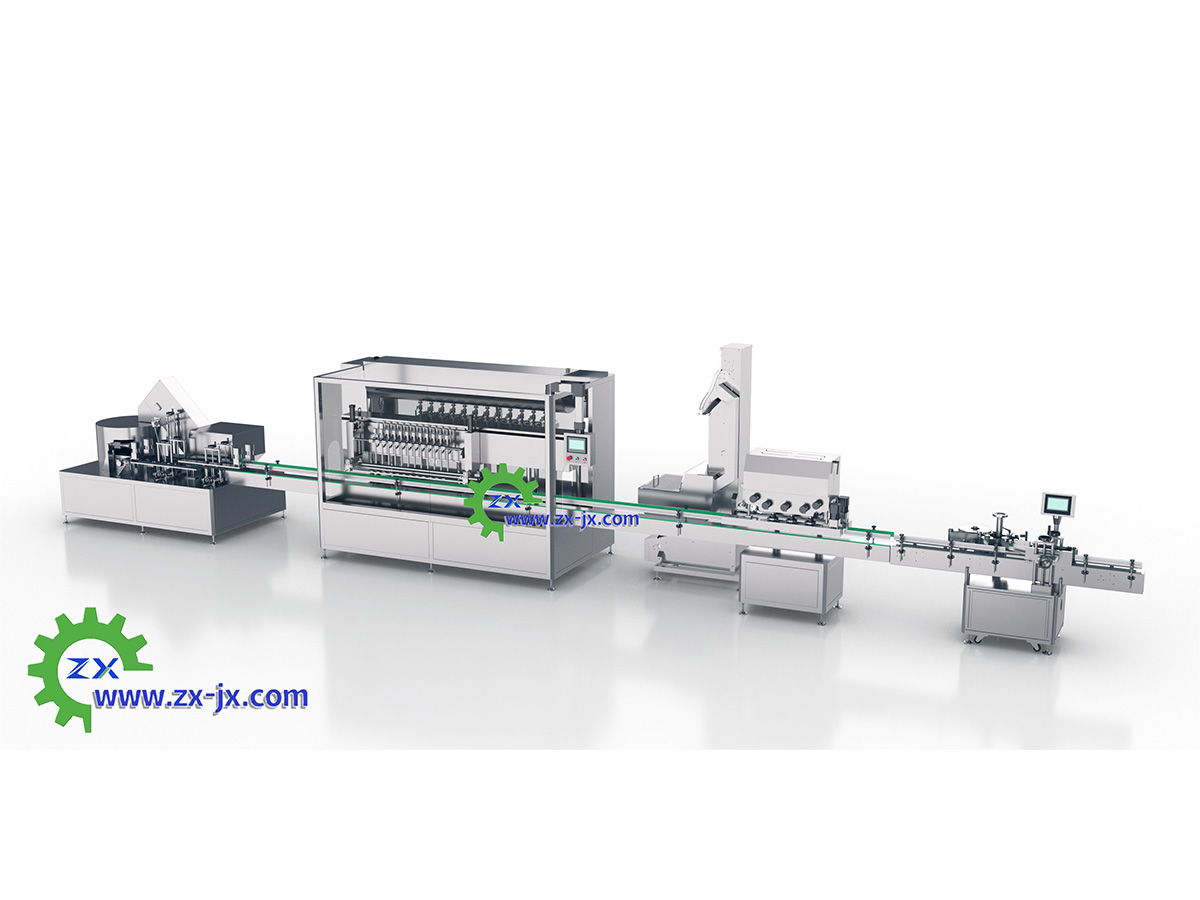 输送带自动送瓶-八头防腐灌装-自动上内塞-自动压内塞-自动上外盖-自动伺服旋盖-产品收集